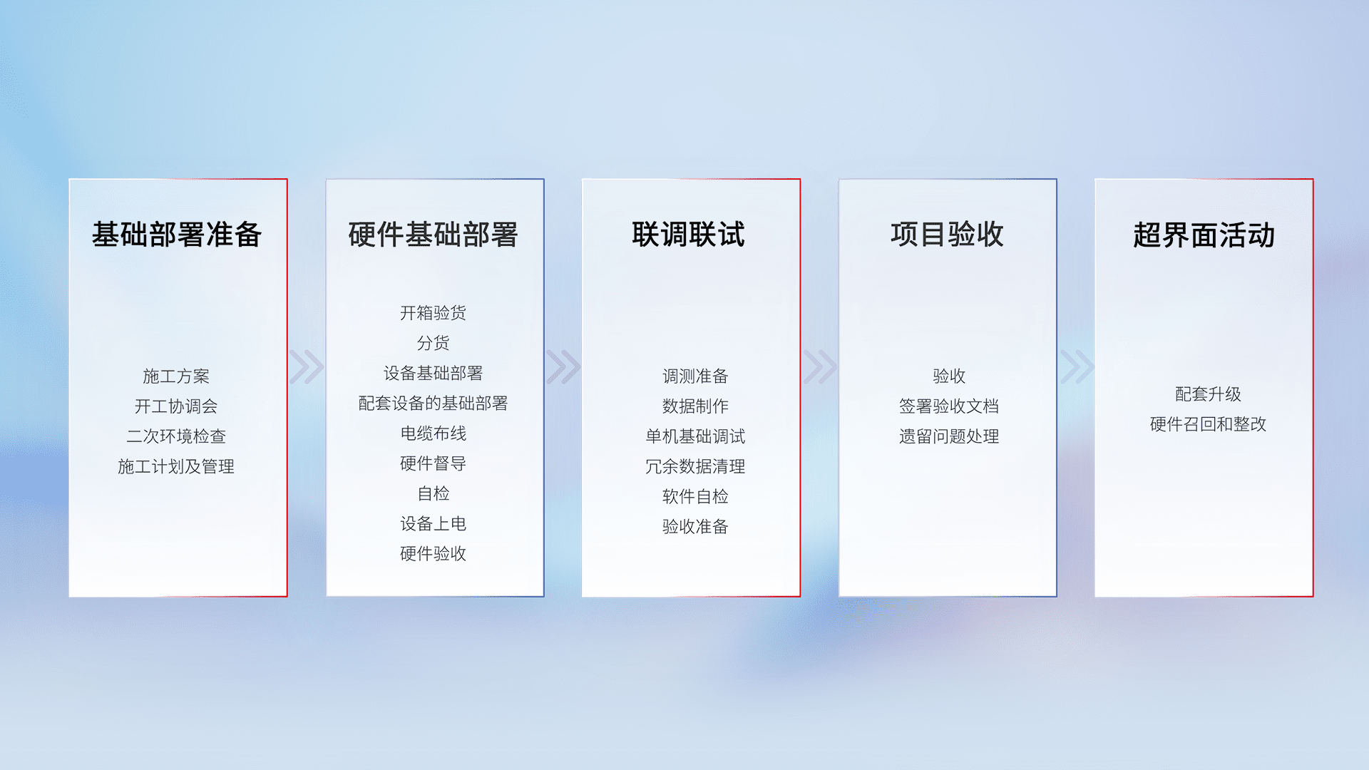 从基础部署准备、、、硬件基础部署、、、联调联试、、项目验收、、越界面活动的全过程可追溯,,,保证施工质量和进度。。